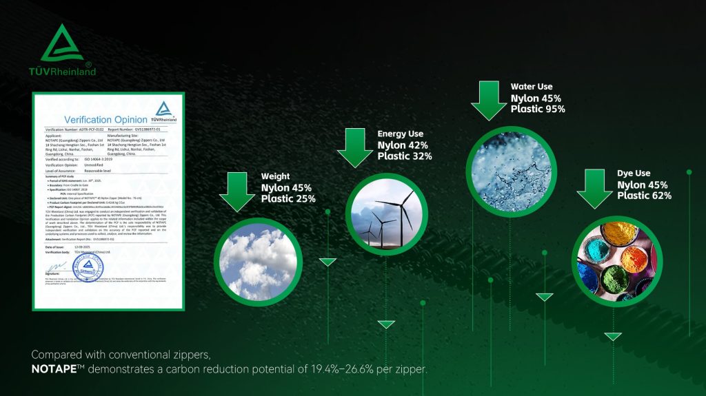 Compared with traditional taped zippers, each NOTAPE™ zipper can reduce carbon emissions by 19.4% to 26.6%. These figures are TÜV-certified, which gives brands more confidence when using the data in sustainability communication and reporting.